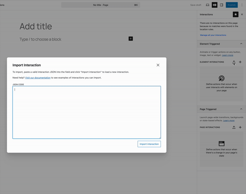 Then, paste the Interaction JSON code copied from the Interaction Example Documentation and click on the Import interaction button. Once pasted, the interaction will automatically be added and ready to use on the selected block.