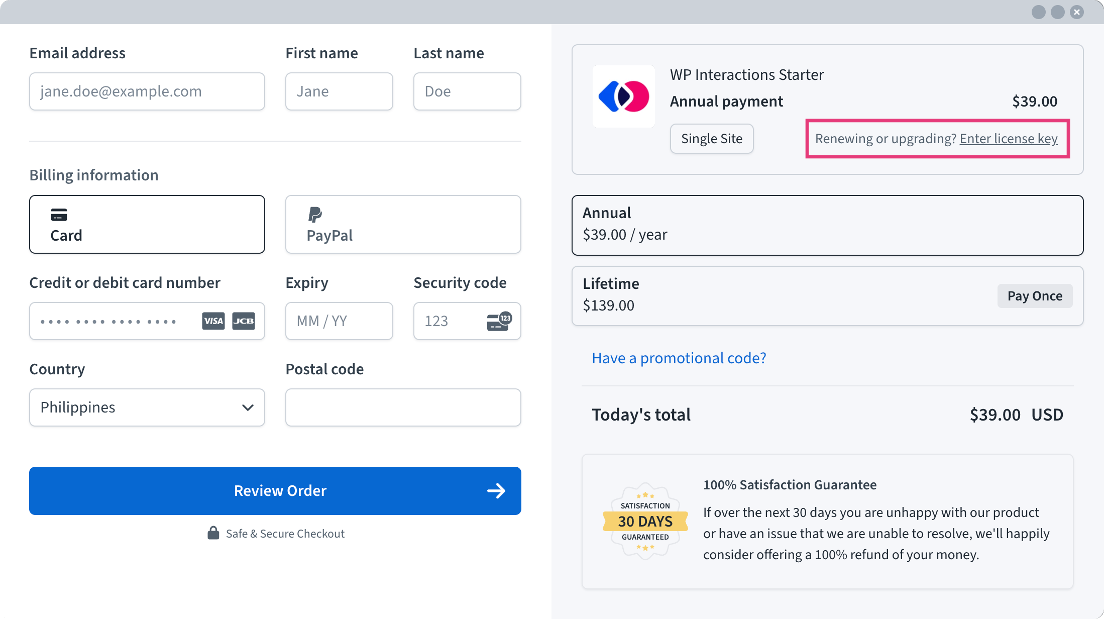 - Before checking out click the Renewing or upgrading a license? then enter your current License Key.